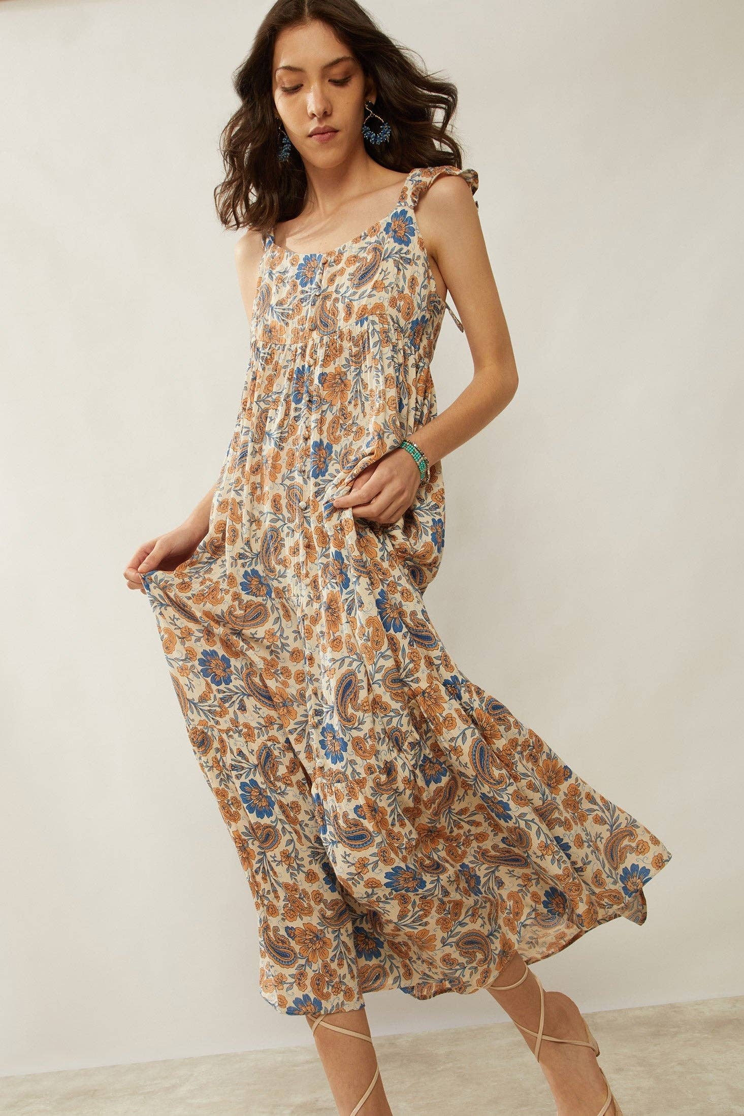 Slimming design, gorgeous colors, the perfect Spring and Summer Dress. With striking paisley pattern in hues of white, sandstone and royal blue, a gathered waist, ruffles and mid-width shoulder straps complete the look with finesse.